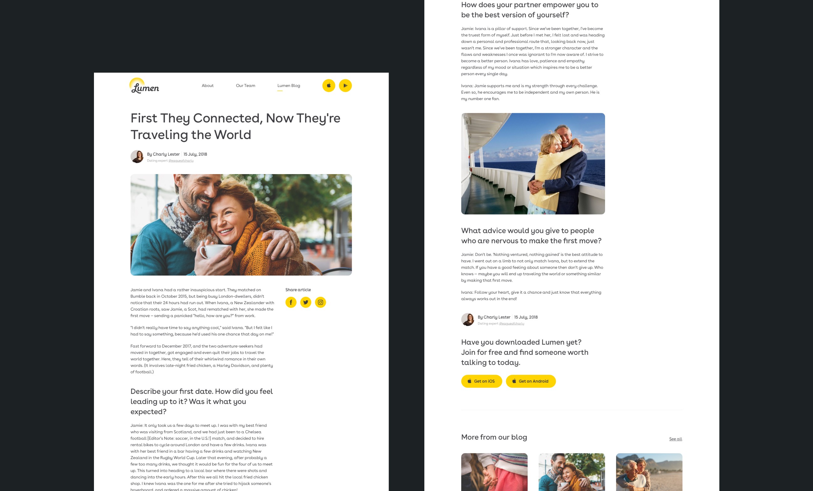 Lumen was a standalone dating app within the Bumble family, specifically designed for users over 50. I served as Senior Product Designer, guiding the project from concept inception through to the initial launch in September 2018. Despite early progress and vision, the app was later closed in 2020 following Blackstone's acquisition of Bumble. I also led the creation of a complementary landing page and blog site to support engagement and storytelling.